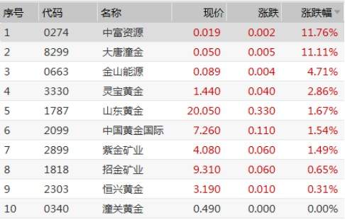 在国际金价大幅上涨的同时,一向“不动则已,一动惊人”的黄金板块在整体下跌的市场中尤为亮眼,截至收盘,板块内个股基本收涨,中国白银集团(00815)涨3.26%,报0.95港元;招金矿业(01818)涨0.65%,报9.31港元;山东黄金(01787)涨1.67%,报20.05港元;紫金矿业(02899)涨1.49%,报4.08港元,就连恒生人民币黄金ETF都顺势涨2%。