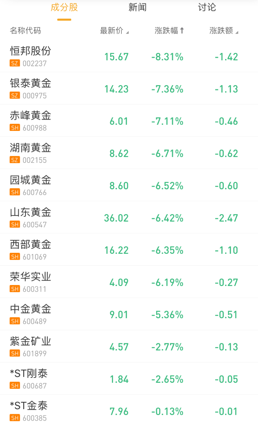 华盛资讯1月9日讯息,受特朗普“拥抱和平”信息影响,黄金板块盘中异动,集体大幅下跌。截至发稿,恒邦股份大跌8.31%,银泰黄金大跌7.36%,山东黄金大跌6.42,招金矿业大跌5.05%,全板块无一翻红。