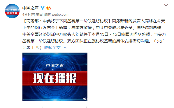 【商务部:中美将于下周签署第一阶段经贸协议】商务部新闻发言人高峰在今天下午的例行发布会上透露,应美方邀请,中共中央政治局委员、国务院副总理、中美全面经济对话中方牵头人刘鹤将于本月13日-15日率团访问华盛顿,与美方签署第一阶段经贸协议。双方团队正在就协议签署的具体安排密切沟通。(央广记者丁飞)