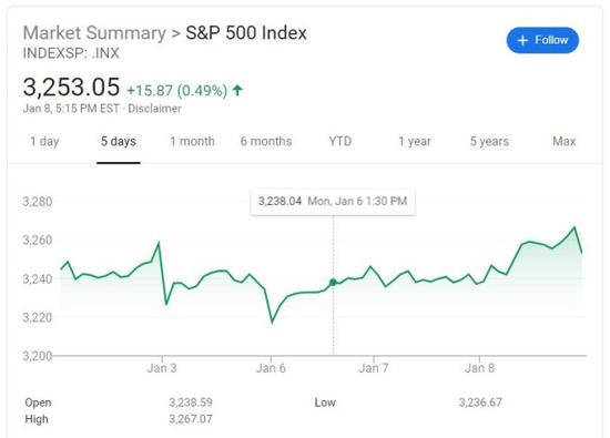 美国标普500指数周三盘中再度创下历史新高,尽管临近尾盘时回吐了部分涨幅,但当日仍上涨近0.5%,这也标志着标普500指数在新年头五个交易日最终录得上涨,涨幅约0.7%。