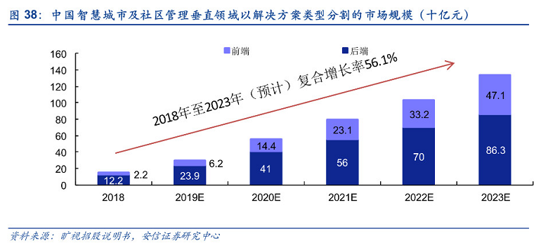 以收入计算,中国智慧城市及社区管理垂直领域的市场规模预计由2018年的人民币144亿元增至2023年的人民币1334亿元,复合年增长率达到56.1%。