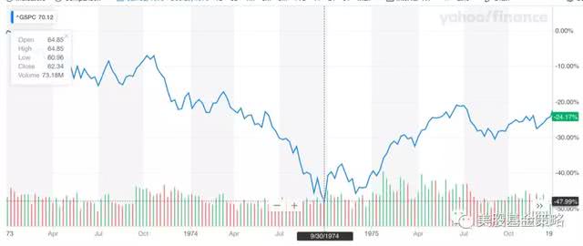 1973年到1975年的美国股市是这样的,最低点跌幅跟后来的次贷危机相当,不过那时可没紧接着的超级牛市,股市反弹后也震荡盘整了几年,1980年代在里根时代才逐步开启新的牛市。