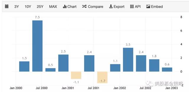 同时,请注意美国的GDP增长,在互联网泡沫破灭后,也从相对高位跌下,甚至进入了一次经济衰退,这次衰退后来被认为起始于2001年3月。