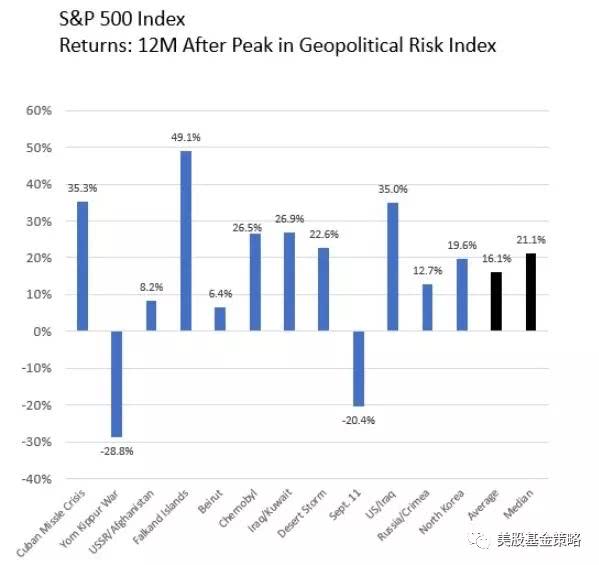 中东美国和伊朗的事件发生后,这几天已经足够热闹,预计还将来回折腾,甚至偶有紧张时刻,但是具体就围观者,不同角度关心的事儿是不同的,从投资来说,当然关心的是对投资的影响,比如油价、黄金、股票,甚至比特币。那么美股呢?此前我也跟大家介绍过美国在几次战争发生后的股市走势,而在近期事件发生后,也有人网上贴出了战后重大地缘政治危机顶峰之后12个月,标普500指数的涨跌情况,让我们来看看。