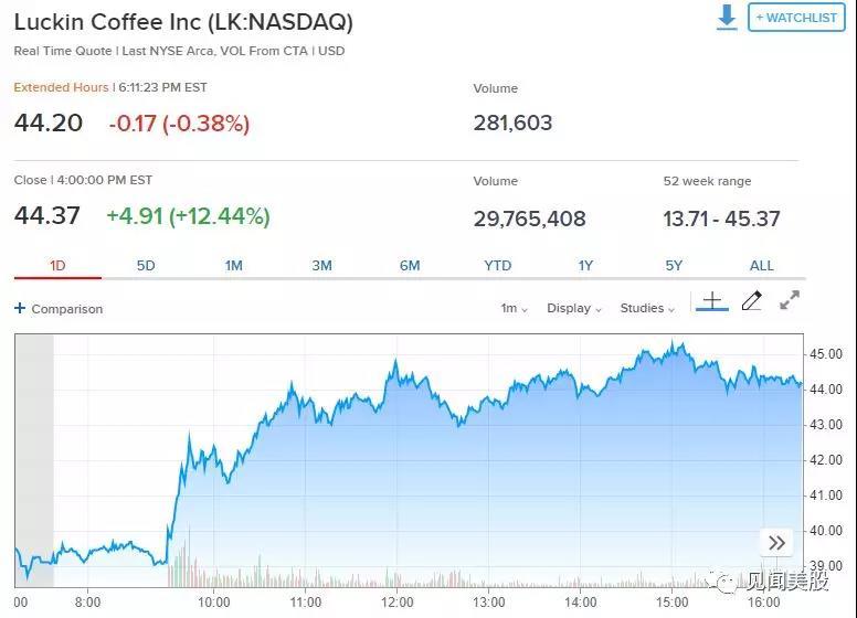 周四(1月9日),在美上市瑞幸咖啡低开0.8%,但随后走高,一度上涨将近14%,刷新盘中历史高位至45.37美元,最终收涨12.44%,刷新收盘历史高位至44.37美元,市值104.4381亿美元。