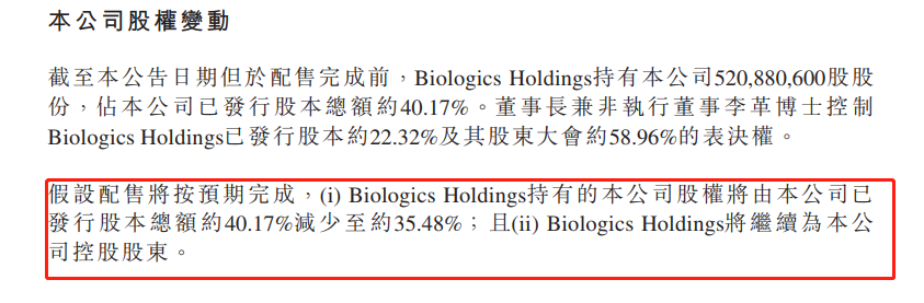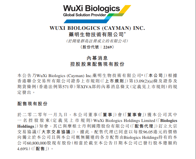 药明生物(02269)今早发布公告,于2020年1月9日,其已与摩根士丹利国际股份有限公司订立大宗交易协议,配售代理已同意以每股96.05港元的价格向独立于公司且与公司概无关连的各方配售由Biologics Holdings持有的公司6080万股现有股份(相当于截至公告日期公司已发行股本总额约4.69%)。假设配售将按预期完成,Biologics Holdings持有的公司股权将由公司已发行股本总额约40.17%减少至约35.48%;且Biologics Holdings将继续为公司控股股东。这一次配股,大股东Biologics就相当于卖出了股份。