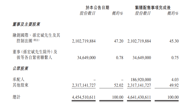 此次配股之后,比如大股东孙宏斌的权益就会由原来的47.2%变成45.3%。