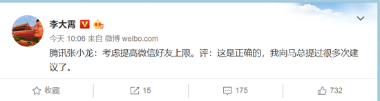 微信创始人、腾讯公司高级副总裁张小龙昨日在微信年度大会上表示,过去学术上有个邓巴数原则,一个人的好友数量最多是150个人,现在已经大大突破,将近一百万微信用户的好友数量接近5000个人,迫使我们考虑提高好友数量的问题。目前微信好友数量设置上限为5000人。