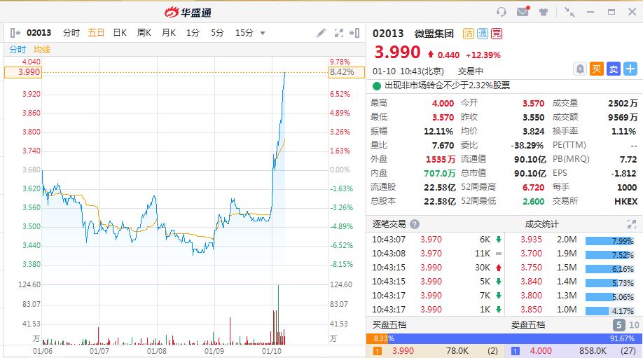 本周四(1月9日),微信创始人、腾讯(00700)公司高级副总裁张小龙在微信年度大会上表示,将考虑提高微信好友数量的问题,目前微信好友数量设置上限为5000人。此外,微信小程序宣布将推出直播组件。受消息影响,截至发稿微盟涨12.39%,报3.99港元,成交额9569万港元。