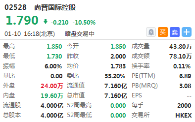 另一只新股尚晋国际控股暗盘低开7.5%,截止16:16,报价1.79港元,跌10.50%,成交额78.1万港元,最新总市值7.16亿港元。