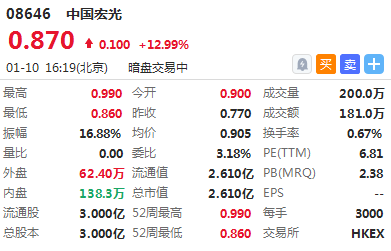 华盛资讯1月10日讯,中国宏光暗盘高开16.88%,截止16:17,报价0.87港元,涨12.99%,成交额181万港元,最新总市值2.61亿港元。