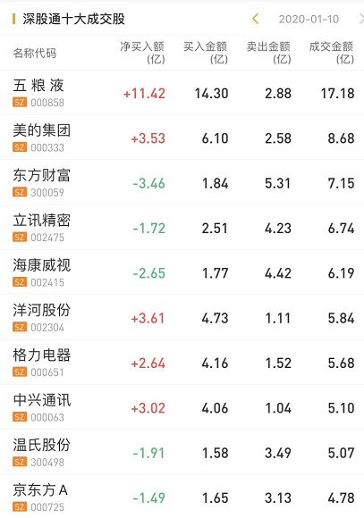 深股通净买入五粮液11.42亿,净买入美的集团3.53亿。