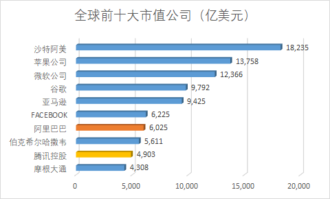 从全球主要上市公司来看,超过6000亿美元市值的公司只有7家,阿里位列第七,市值能占到石油巨擘沙特阿美的1/3,微软市值的1/2,比Facebook市值相当,比腾讯市值多出1000多亿美元。
