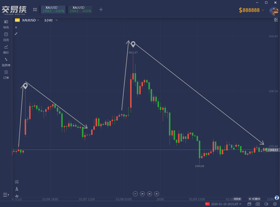 周三伊朗以数十枚导弹袭击美国在伊拉克的阿萨德空军基地,黄金从1570关口下方一度飙涨至1611.27美元/盎司水平,但随后美国方面表示没有人员伤亡,美国总统特朗普也发声明表示不希望使用军事力量,紧张局势稍微平息,黄金狂泻不止,回落60美元至1550美元关口下方。