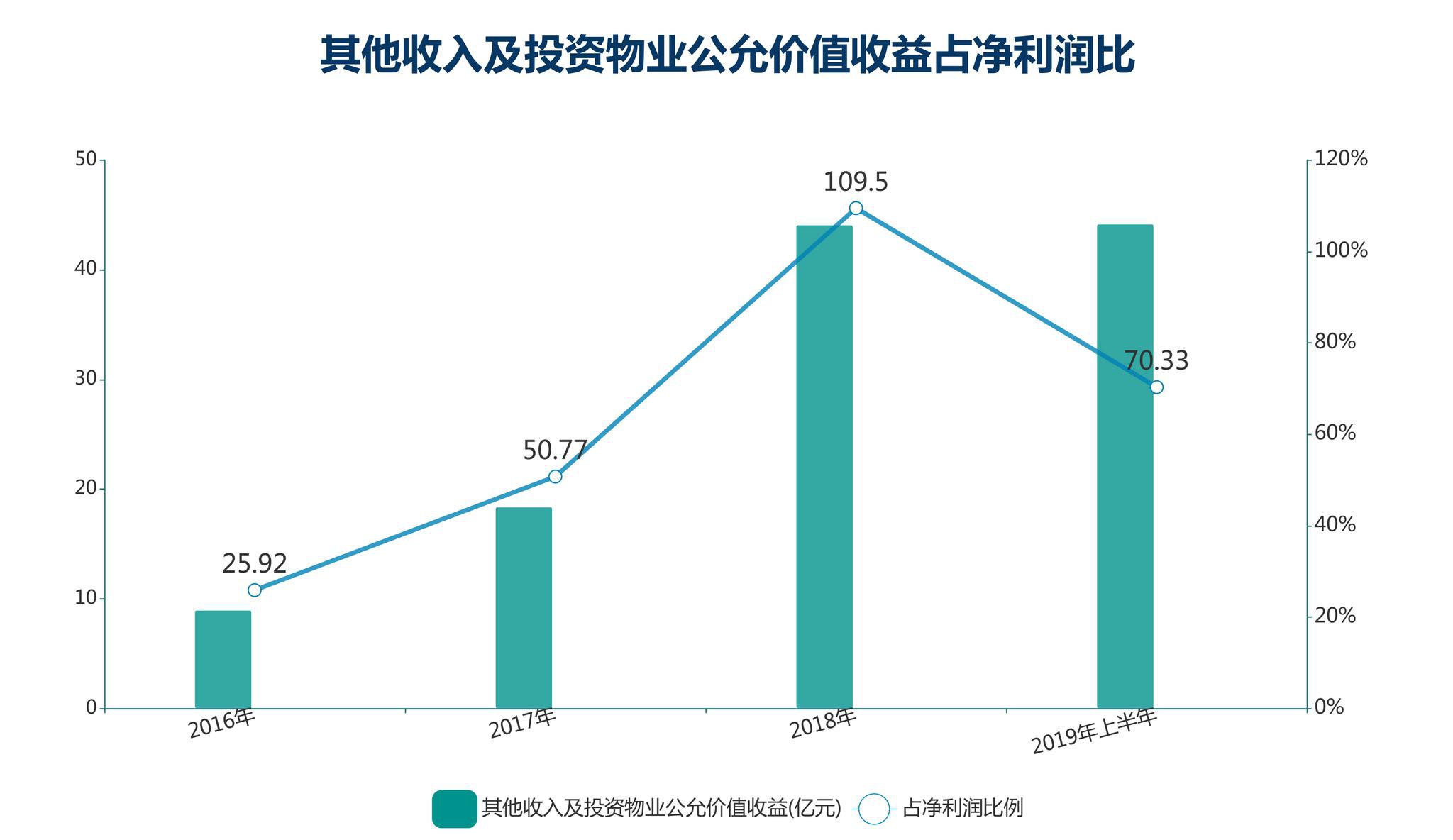 查阅财报可以发现,近两年来,合景泰富“其他收入及收益”和“投资物业公允价值收益”的总和占净利润比重大幅增加,尤其是2018年增至109.5%。2019年上半年,该两项收益合共41.94亿元,占比70.33%。