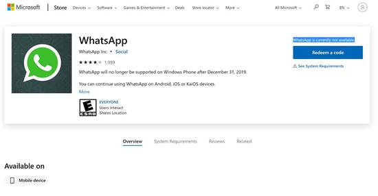 既然Windows Phone距离终止支持还有不到一周时间,WhatsApp已决定是从商店中删除其应用程序。Windows Phone上对WhatsApp的支持在2019年12月31日后终止。现在我们发现,WhatsApp在Microsoft Store中不再可用。