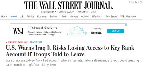 【环球网报道 记者 丁洁芸】美国与伊朗避免陷入热战泥沼后,又和伊拉克就撤军问题展开了拉锯战。美国有媒体11日援引伊拉克官员消息称,特朗普政府警告伊拉克,如果巴格达将美军驱逐出该地区,伊拉克可能无法使用其在纽约联邦储备银行的账户。