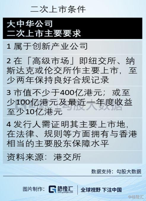根据港交所规定,中概股若想二次上市,需满足数个条件:属于创新产业;曾于高级市场主要上市且至少两年保持良好合规;市值不少于400亿港元或不少于100亿港元且最近一年度受益不低于10亿港元;主要上市地主要股东保障水平与香港相当。