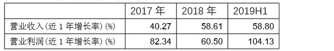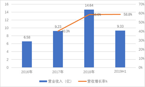 接下来讲一下公司历年的营业收入和增速,其实这几年的营业收入和增速都非常快,2016年是6亿多的营收,2017年就9亿多,增速在40%多,然后2018年的增速大概是60%不到的速度,达到了44%,今年上半年的收入大概是9.33亿,那也是接近60%的一个增速,这个增速也是非常快的。同样净利润增速也是比较快的。17年增速大概80%左右,然后18年业绩归母净利润的增速大概是60%左右,今年上半年增速是超过100%。