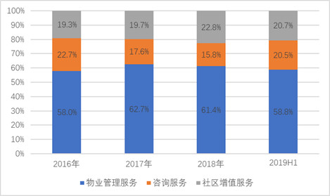 上面这张图是蓝光嘉宝的各项收入的占比,大家其实可以很明显看出来,就是说它的主营收入中基础物业管理服务占比58%,今年上半年也就是说接近60%的左右。它的咨询服务收入是占比20%左右。社区增值服务占比20%左右,这两块在整个物业行业里面算是比较高的。