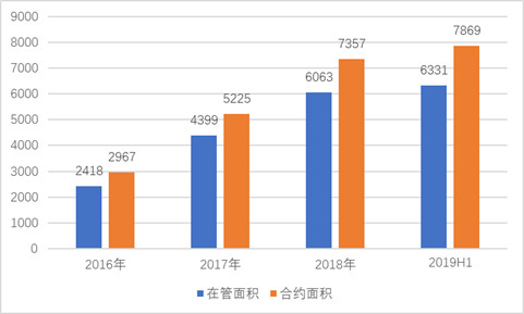 上面这张图说明了公司的在管面积与合约面积的增速都很快。在管面积2016年2400多万方,2017年4000多万,2018年6000多万方。今年上半年增速比较慢,公司解释说为了准备IPO所以暂停了很多的收并购业务。公司早期其在管物业其实主要是来自于蓝光发展,但是目前来说,蓝光发展提供的物业面积占比越来越小,第三方已经占比超过50%了。
