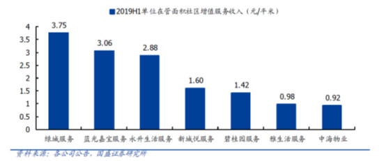 这张图可以看出来,其实蓝光嘉宝今年上半年单位在管面积的社区增值服务收入是3.06元,仅次于绿城服务,比永升生活还要高。这一块是它的特色,占比比较高,20.7%。