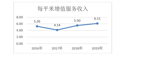 蓝光的在管面积不断扩大,每平米的增值服务收入也是在不断的增长,除了2017年下跌以外,2016年5.26元,2017年4.14元,2018年5.50元,现在是6.1元,就是说今年上半年×2的话就6.1,我这样一个算法,也就是说他每平米的增值一年的增值服务大概是6元钱左右;假设他未来几年保持,虽然面积这块面积不断扩大,但是每平米的增值服务收入还是保持在6元钱左右。