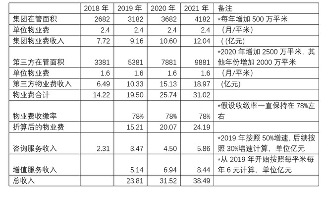 同样咨询服务收入,我按照2019年增速50%,而后续每年30%的一个增速来计算增值服务收入。按照在管的面积从2019年开始,每平米按每年的收入按6元计算。这样算下来,2019年收入大概是23.81亿,31.52亿,2012年是38.49亿,按照公司的净利润水平20%的水平,大概2019年的净利润是4.76亿,2020年是6.3亿,2021年是7.7亿。