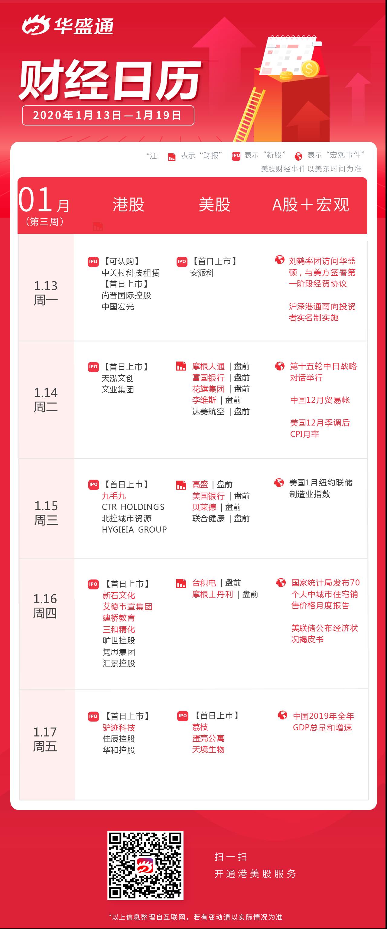 1. 宏观上,周一,刘鹤将率团访问华盛顿,中美签署第一阶段经贸协议;周五,中国2019全年GDP数据重磅出炉!