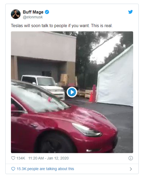 新浪科技讯 北京时间1月13日早间消息,据国外媒体报道,特斯拉公司CEO埃隆·马斯克(Elon Musk)周日发布了一个视频,在这个视频中,一辆特斯拉Model 3车辆正在说话。在视频中,这辆车说的话是:“别只是站在那儿,快上车。” 之后又说了一句:“这句话你练习很久了吗?”这个视频的标题是:“如果你愿意的话,特斯拉马上将会和人说话。是真的。”马斯克是人工智能的粉丝,这几乎是尽人皆知的事情,他非常希望在特斯拉汽车中使用人工智能技术,而且不仅仅是将它用在自动驾驶上面。