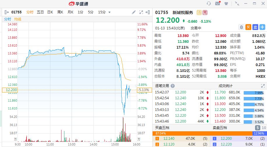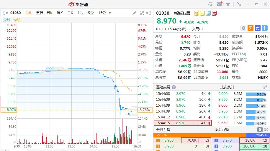 新城系尾盘突现跳水,相关个股放量急挫。截至15时45分,新城悦服务(01755)跌5.13%,报价12.2港元,新城发展(01030)跌6.76%,报8.97港元。