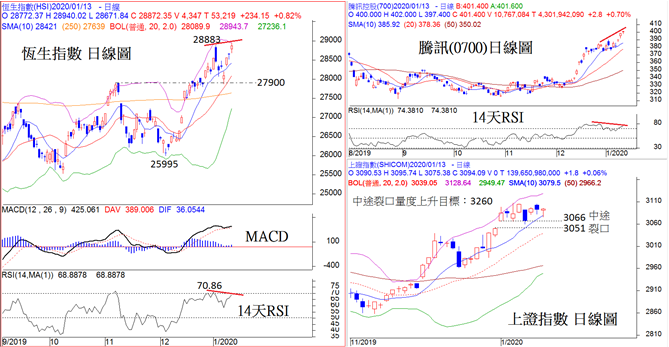 從日線圖看,恆指升穿28883頂部之後,最近的阻力是20天保力加通道上限線28950左右,然後是去年6月高位29008,後者剛好與30280至24899跌幅的0.764倍反彈目標29010極接近。值得留意是,隨着大市今早創新高,雖然促使MACD回復買入訊號,但14天RSI卻在超買區呈現初步的雙頂背馳,如果恆指今日受制於20天保力加通道上限線阻力,然後最終低收的話,則表示RSI頂背馳應已發揮利淡作用。當然,如果恆指持續高收的話,則表示頂背馳仍未算成立。