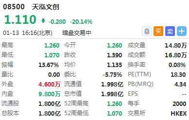 天泓文创暗盘低开9.35%,截止16:17,报价1.11港元,跌20.14%,成交额16.8万港元,最新总市值1.998亿港元。