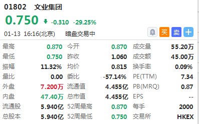 华盛资讯1月13日讯,新股文业集团暗盘低开17.92%,截止16:17报价0.75港元,跌29.25%。