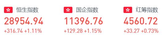 周一收盘,恒生指数涨1.11%,报28954.94点。国企指数涨1.15%,红筹指数涨0.73%。