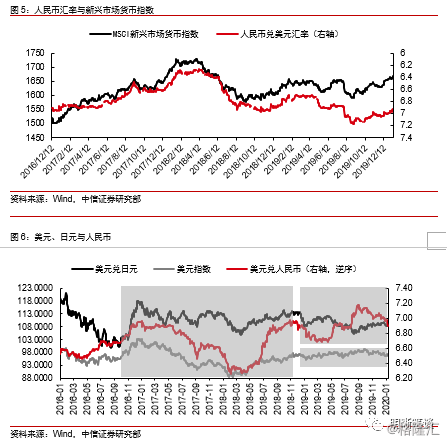 在新兴市场货币走势的大背景下,风险情绪的提振对于人民币汇率的影响较大,美元指数的上涨或为短期现象。人民币汇率的升值,可以放到新兴市场货币走势的大背景下。从人民币汇率和新兴市场货币指数来看,二者的变动方向一致。考虑到上周人民币汇率上涨0.67%而新兴市场货币指数上涨0.51%,人民币实际上或是新兴市场货币领涨因素。鉴于新兴市场货币和股票指数都在升值,美元指数的上涨或为短期现象,新兴市场仍将获阶段性青睐。人民币汇率和新兴市场货币指数升值的重要因素之一是风险情绪的提振,包括中美第一阶段贸易谈判等因素是重要因素,而风险情绪在美元指数区间震荡的行情中格外重要。2019年以前,人民币汇率与日元汇率走势看起来更多受到美元指数的影响。进入2019年,美元指数震荡,难以从大方向上影响日元和人民币汇率,因此人民币汇率和日元汇率表现出较强的反向关系,这也体现出风险情绪的因素影响较大。