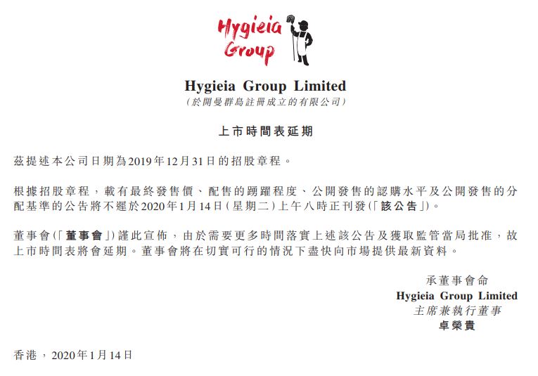 HYGIEIA GROUP(01650)发布公告,根据招股章程,载有最终发售价、配售的踊跃程度、公开发售的认购水平及公开发售的分配基准的公告将不迟于2020年1月14日上午8时正刊发。由于需要更多时间落实上述该公告及获取监管当局批准,故上市时间表将会延期。
