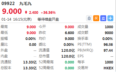 华盛资讯1月14日讯,九毛九暗盘高开36.36%,报价9港元,截止16:16,成交额1190万港元,最新总市值120亿港元。