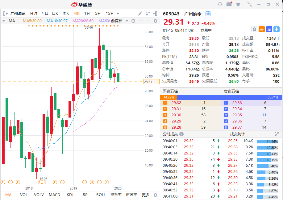 陈星海先生1935年创办“西南酒家”,1939年重建后取意“食在广州”而改名为“广州大酒家”(后称“广州酒家”),迄今已有80年的历史,是一家“中华老字号”企业,最初以经营传统粤菜驰名,后期开始发展其它业务,目前公司主营业务为以月饼、速冻食品等为主导产品的食品制造,以及提供粤菜和广式点心为主的餐饮服务。广州酒家的股价走的一直比较稳健,是粤系餐饮大牛股。