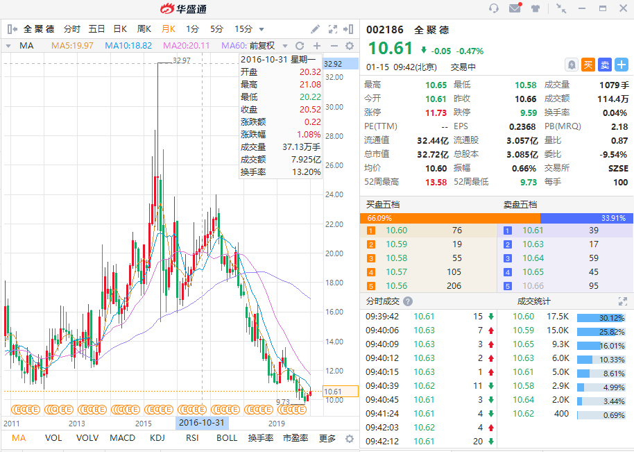 全聚德创建于1864年(清朝同治三年),历经几代全聚德人的创业拼搏获得了长足发展。全聚德主打是北京烤鸭,1999年1月,"全聚德"被国家工商总局认定为"驰名商标",是我国第一例服务类中国驰名商标。全聚德也曾有过突飞猛进的时候,但在异地、海外扩张并没有受到大家的欢迎,而且价格昂贵,稍微显得不亲民,股价表现平平。