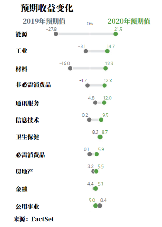 分析师表示,预计在2020年,美股形势也会有所逆转。FactSet分析师预计标普500指数中能源、工业和材料行业的收益将会以两位数增长,领先于标普500指数内11个上涨的行业类别。