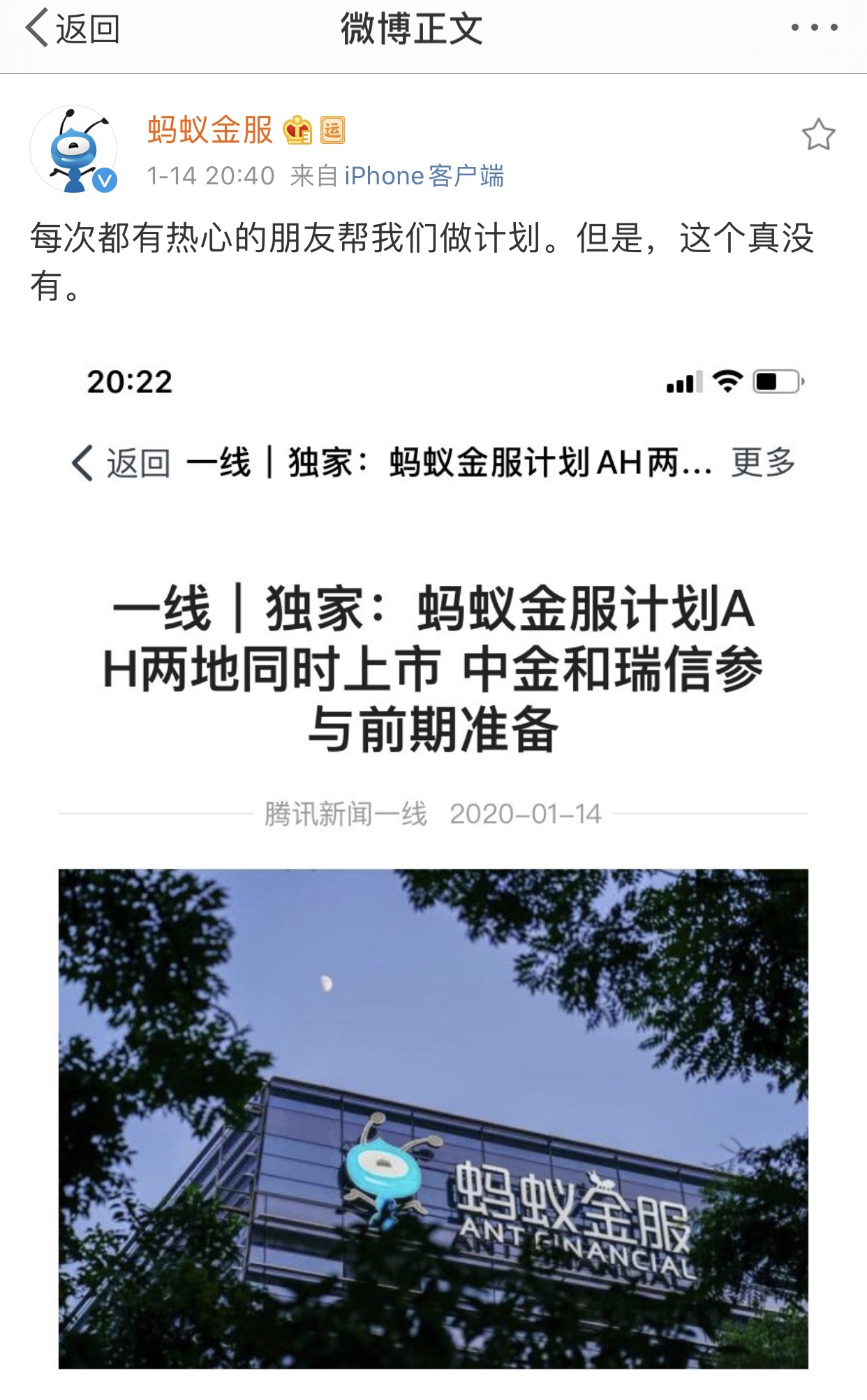 针对其计划在“A+H”两地同时上市的消息,蚂蚁金服1月14日晚间快速在其官方微博回应称:“每次都有热心的朋友帮我们做计划。但是,这个真没有。”