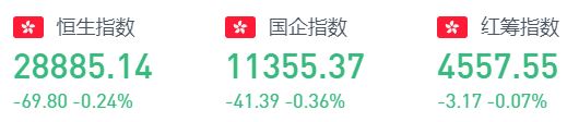 周二收盘,恒生指数跌0.24%,报28885.14点,国企指数跌0.36%,红筹指数跌0.07%。