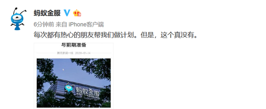 蚂蚁金服赴港上市的消息传开以后,引起了投资者的广泛关注,而蚂蚁金服也对此在官方微博上做出回应。蚂蚁金服通过官方微博回应称“每次都有热心的朋友帮我们做计划。但是,这个真没有。”
