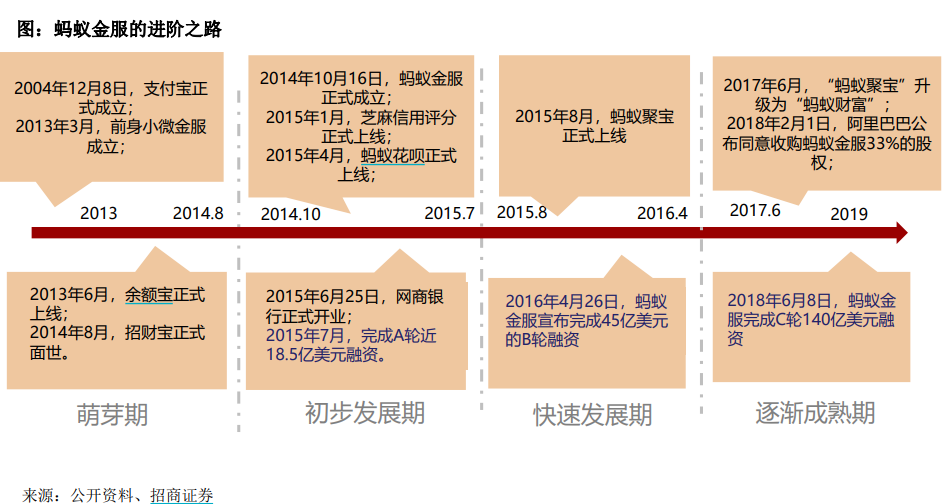 蚂蚁金服起步于2004年成立的支付宝,最初为解决淘宝交易平台的信用问题,公司于2014 年10月正式成立,借助阿里的生态体系得到迅速发展,根据蚂蚁金服最新一轮融资数据,估值已达到1500亿美元,超过10300亿元人民币。