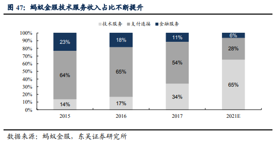 2017年支付连接是公司最大的营收来源,技术服务是公司增长最快的业务,东吴证券预计2021年蚂蚁金服技术服务占比将达到65%,成为公司营收支柱,而金融服务占比下降到6%。