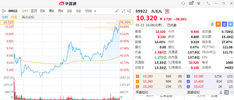 九毛九首日挂牌延续暗盘涨势,最终收盘价为全天最高点,涨幅达56.39%,报价10.32港元,若以发行价买入,不计手续费一手赚3720港元,成交额35.49亿港元,市值达137.6亿港元。行情来源:华盛证券