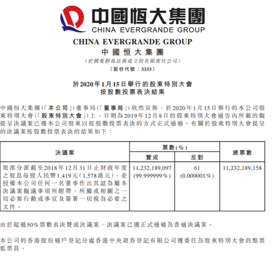 新浪港股讯 1月15日消息,中国恒大在港交所公告:股东大会正式通过派发2018年度股息事宜,股息为每股1.578港元,涉及资金总额为208.02亿港元。