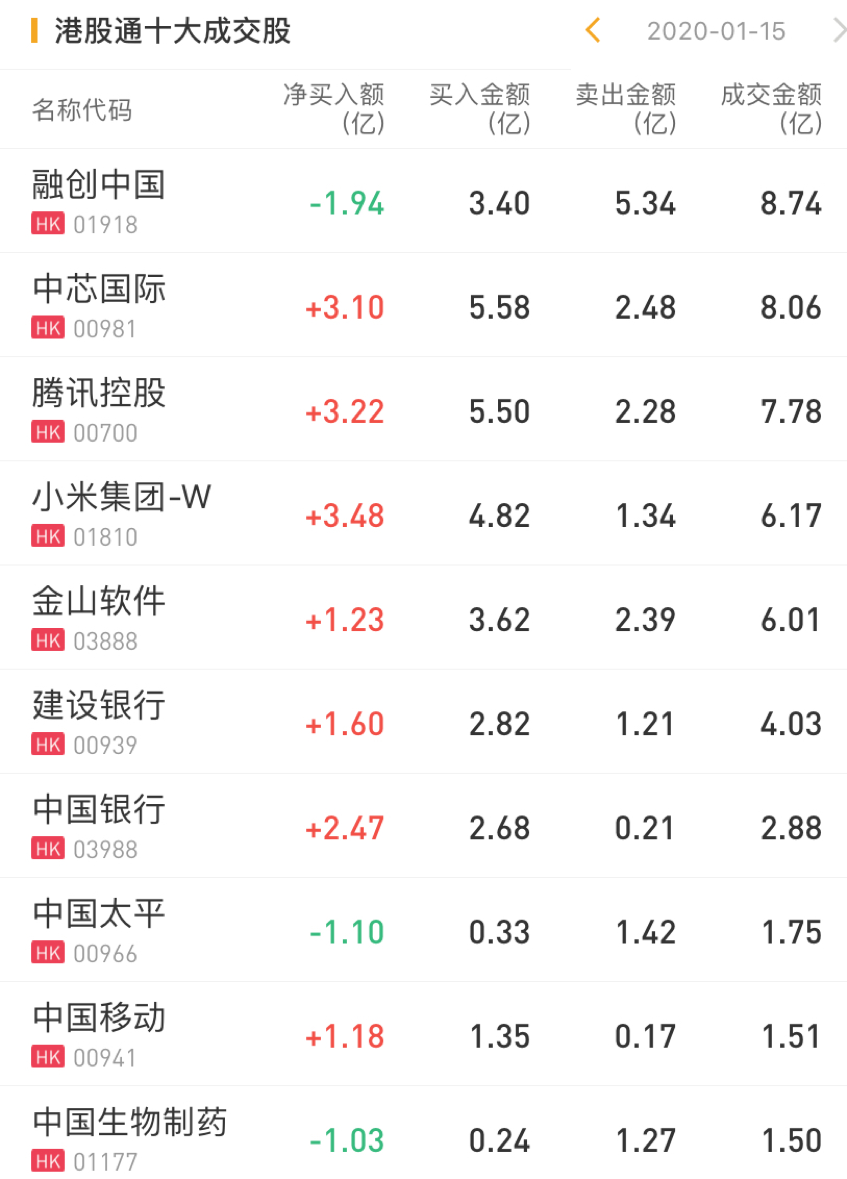 港股通资金今日净流入港股27.63亿港元。今日净买入腾讯控股3.22亿港元,净买入小米集团3.48亿港元,净买入中芯国际3.10亿港元。