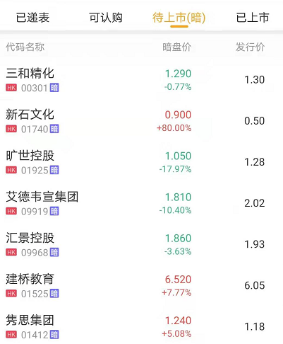 华盛资讯1月15日消息,截止暗盘收盘,7只新股中3只收涨,其中新石文化收盘涨80%,报价0.90港元, 不计手续费,一手赚2000港币,成交额6410万港元,最新总市值9.0亿港元。建桥教育收涨7.77%,不计手续费一手赚235港元;隽思集团收涨1.08%,不计手续费一手赚120港元。